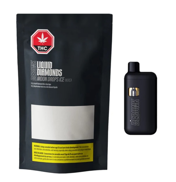 DEBUNK Moon Drops Ice All-in-One Vape is indica-dominant with lychee, pear, citrus, and berries. Hydrocarbon process turns THCA diamonds into THC liquid diamond isolate, enhanced with botanical terpenes. Housed in USB-C rechargeable hardware with a wide-mouth airflow to reduce clogging.