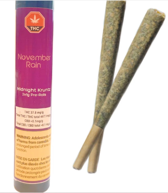 The Midnight Kruntz 2x1g Pre-Rolls are a premium cannabis product known for their high THC content and rich flavor profile.
