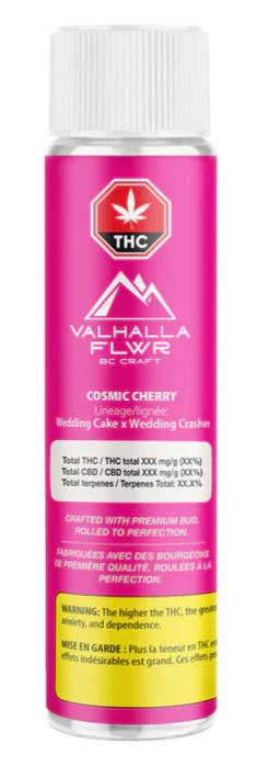 Award-winning, never-irritated, craft legacy genetic made from Wedding Cake and Wedding Crasher. Cultivated indoors in small batches with LED lighting in coco medium, itÕs hang-dried, hand-trimmed, and cured to perfection. This cultivar features dense green buds with purple undertones, covered in trichomes. Enjoy its earthy, herbal aroma and cherry flavour that defines Cosmic Cherry, with terpenes dominant in cedrene, humulene, and carene. Each pre-roll comes with a humidity pack to ensure a flawless burn every time.